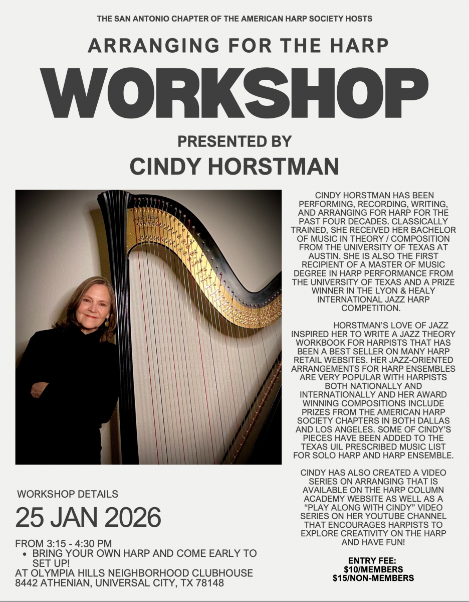 The San Antonio Chapter of the American Harp Society presents 'Arranging for the Harp Workshop' with Cindy Horstman.